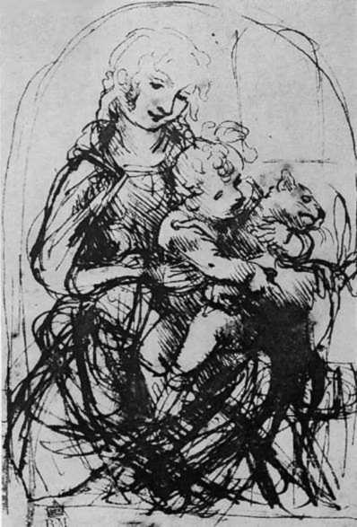 INFORMATION: Da Vinci’s notebook shows a drawing (below) that includes the Jesus child playing with a cat. Leonardo may have planned to draw and paint this picture. The drawing is closely connected to the Benois Madonna.